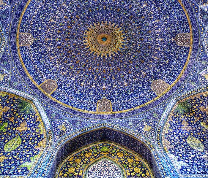 Facing northwards, the mosque’s portal to the Maidan is usually under shadow but since it has been coated with radiant tile mosaics it glitters with a predominantly blue light of extraordinary intensity. The ornamentation of the structures is utterly traditional, as it recaptures the classic Iranian motifs of symbolic appeal for fruitfulness and effectiveness. Within the symmetrical arcades and the balanced iwans, one is drowned by the endless waves of intricate arabesque in golden yellow and dark blue which bless the spectator with a space of internal serenity.