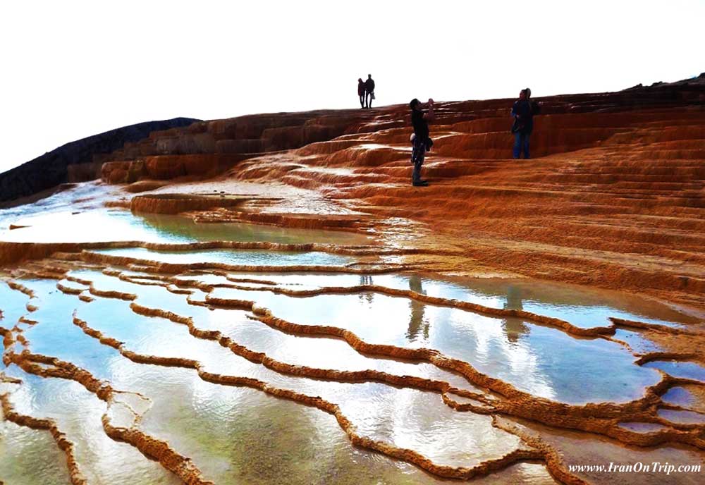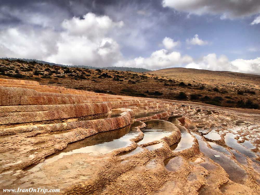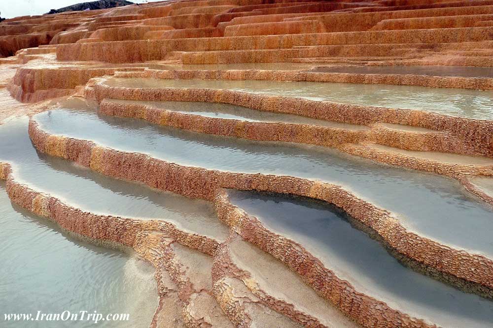 Badab Sourt is made of a range of stepped travertine terrace formations thousands of years ago, as flowing water from two hot mineral springs cooled and deposited carbonate minerals on the mountainside.The Badab Sourt Spring is actually comprised of two separate springs with completely different colored and scented water. The first spring contains very salty water that gathers in a small natural pool.During the summers locals swim in the pool and believe its water is useful for curing back aches, rheumatism and skin diseases. The second spring has a sour taste and is predominately orange mainly due to the large iron oxide sediments at its outlet.